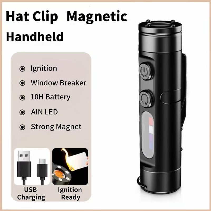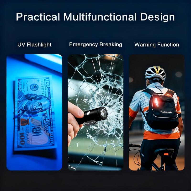 This EDC flashlight isn’t just a light source – it’s a 5-in-1 emergency & daily tool. Boasting a high-intensity main light (reaching 100 meters) and 9 versatile lighting modes (including UV for counterfeit detection, red/blue strobe for signaling), it keeps you visible and prepared. It also doubles as an emergency window breaker (tungsten steel tip) and features a built-in fire starter – covering every base for safety and utility.
