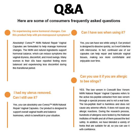Extensive research shows that these ingredients work synergistically to balance hormones, reduce inflammation, enhance metabolism, and maintain overall health. Cvreoz® Bee Venom NMN Natural Repair Vaginal Capsules combine them in a scientifically formulated blend, providing a comprehensive approach to women's health. Each ingredient is backed by scientific evidence, ensuring the product's efficacy and safety, which users can trust.